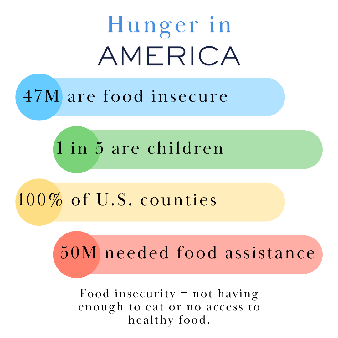 According to Feeding America, 47 million people in the United States are food insecure, including 14 million children. Every county in every state has food insecurity. What does that mean? Millions of our friends and family, neighbors and strangers, don’t have enough food to eat or access to healthy food.