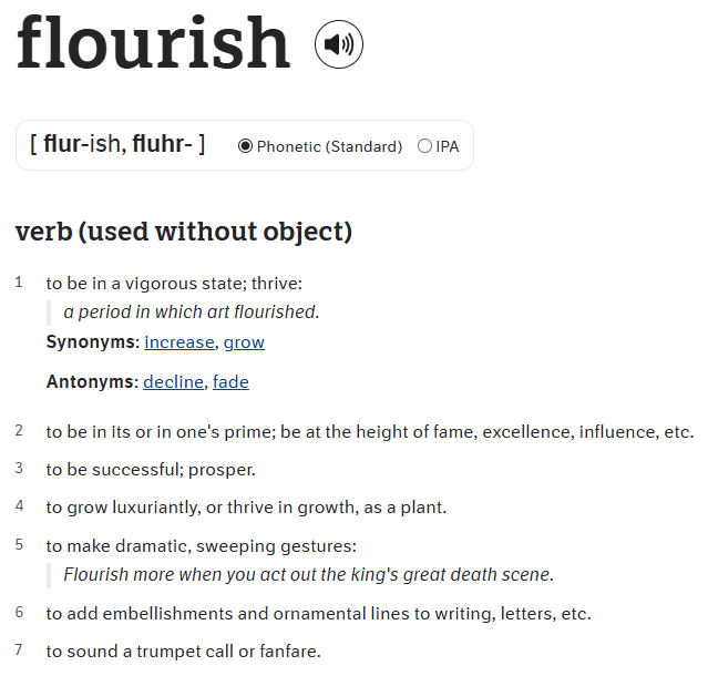 I love every one of these definitions. There isn’t a bad one in the bunch. Thrive; grow (luxuriantly); be in my prime; be successful; prosper; make sweeping gestures; add embellishments or fanfare…yes, please!