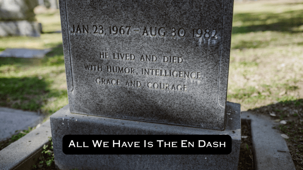 The en dash on a gravestone represents a whole life—everything that happens to a person between the time they are born and the time they die. As I grow older, I’ve meditated on my own en dash. Though I’m in no hurry to reach the end of life, it is closer than my birth date. And I believe we should all periodically think about how we live our everyday lives.