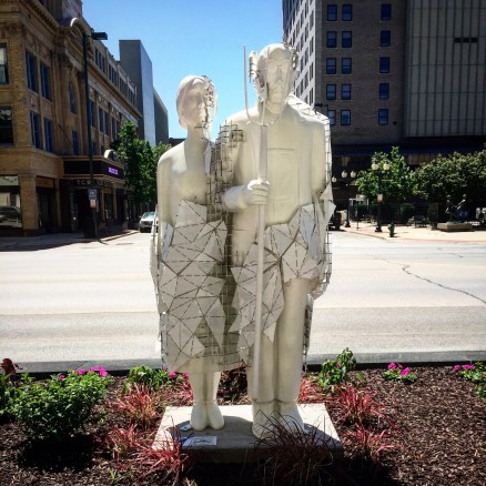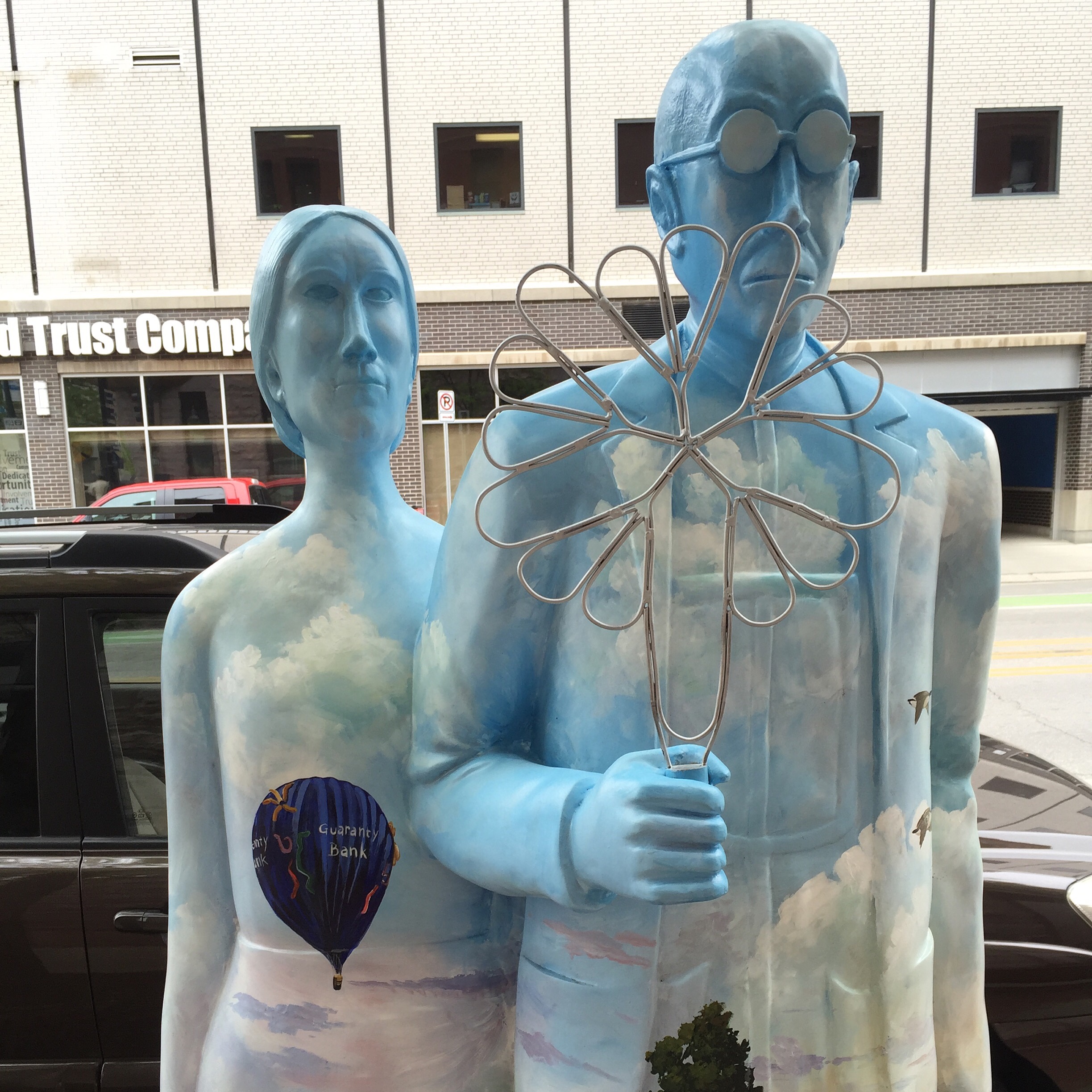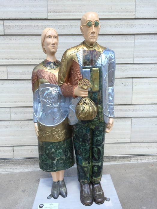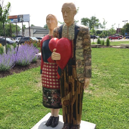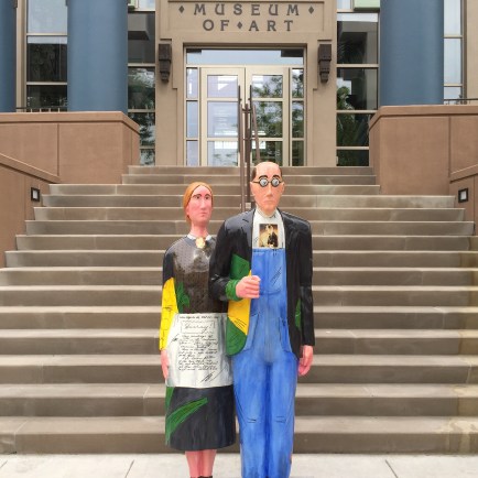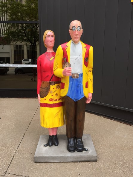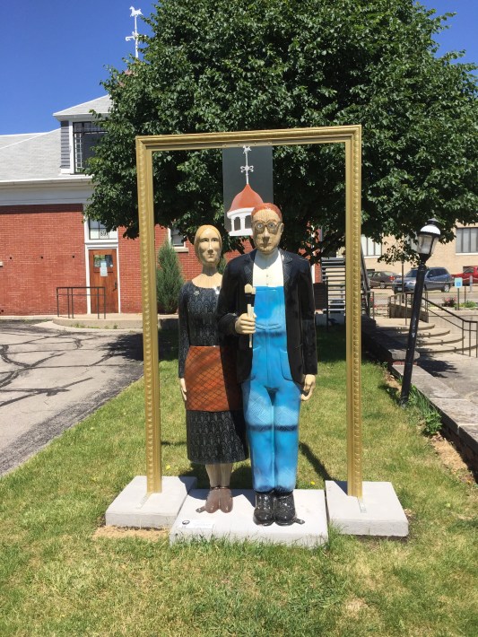 A cultural icon, it is displayed at the Art Institute of Chicago. Wood drew a picture of a small farm cottage near Eldon, Iowa, and placed in front of it the likenesses of his sister and a Cedar Rapids dentist (no, not a farmer). Trivia note: They never really stood in front of that house or even together.