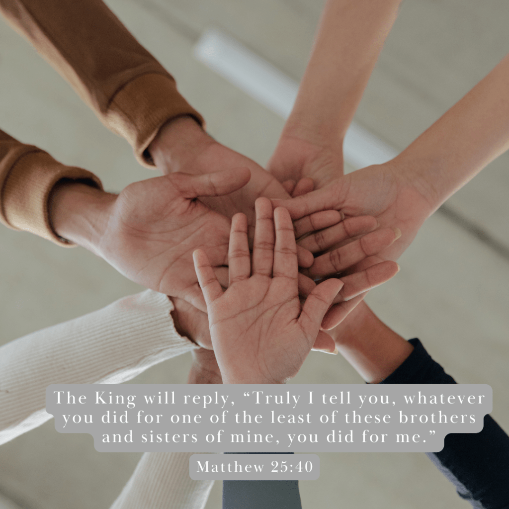 children's hands all meeting in the middle with Matthew 25 verse 40.