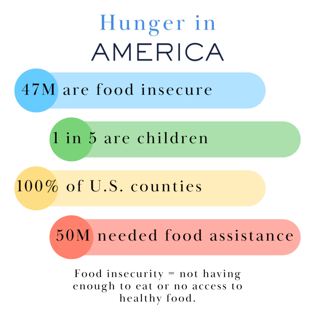 According to Feeding America, 47 million people in the United States are food insecure, including 14 million children. Every county in every state has food insecurity. What does that mean? Millions of our friends and family, neighbors and strangers, don’t have enough food to eat or access to healthy food.
